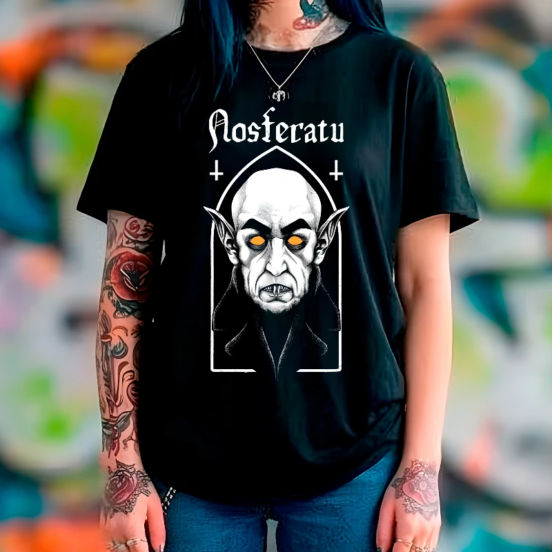 Invoca la esencia del horror clásico con esta playera que captura la silueta inolvidable de "Nosferatu". Perfecta para los amantes del cine expresionista alemán y la estética gótica, esta prenda es una declaración de estilo oscura y elegante.