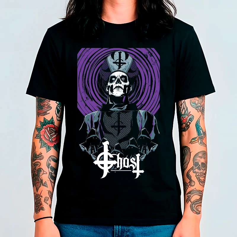 Celebra el legado de los Papa Emeritus con este diseño espectacular que captura la esencia teatral y macabra de la banda GHOST. Sobre un fondo negro intenso, esta prenda es una verdadera obra de arte que rinde homenaje al líder de la congregación.