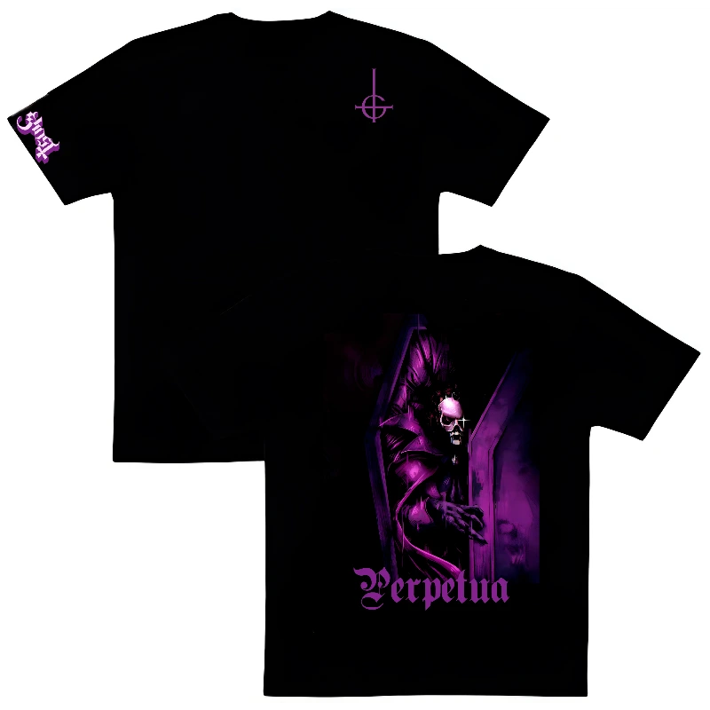 ¡Desde la oscuridad perpetua! Esta no es solo una playera, es una declaración de devoción gótica. Diseñada para los verdaderos miembros del Clero, esta prenda captura la esencia teatral y macabra de GHOST, fusionándola con la estética clásica del terror vampírico.