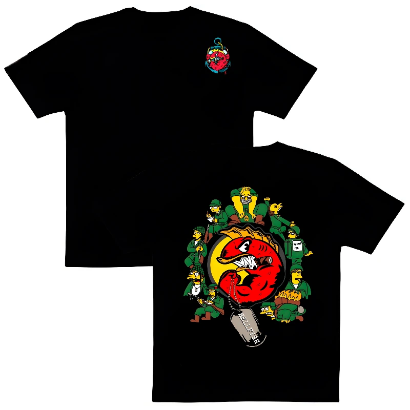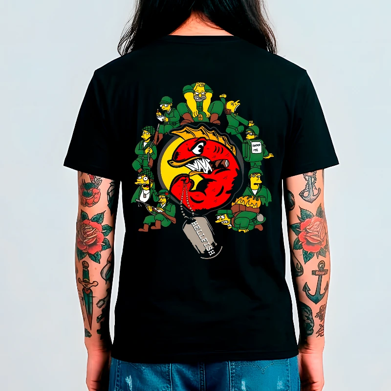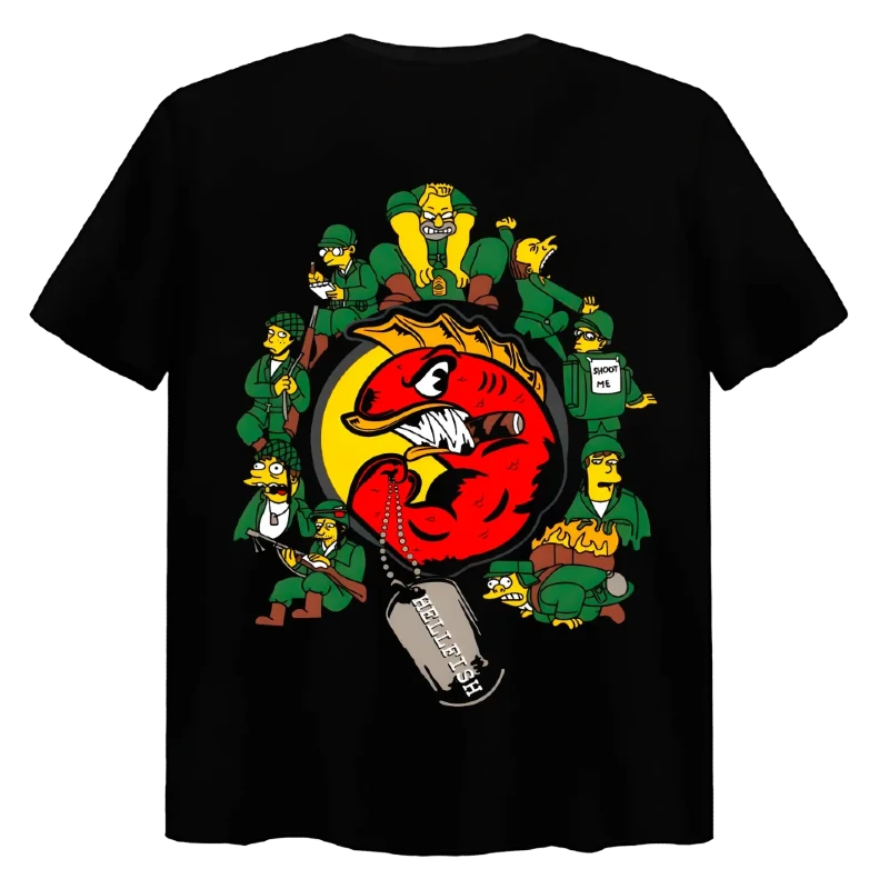 Rinde homenaje a uno de los episodios más épicos y legendarios de Los Simpsons con esta playera de "Hellfish". Es una pieza de colección que celebra la valentía, la traición y la búsqueda del tesoro de la unidad militar más infame de Springfield.