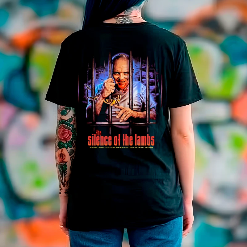 Diseñada sobre un intenso fondo negro, esta playera presenta un diseño meticuloso que encantará a los verdaderos fans de "The Silence of the Lambs". Es perfecta para un maratón de películas, una salida nocturna o simplemente para demostrar tu impecable (y escalofriante) gusto por el cine.